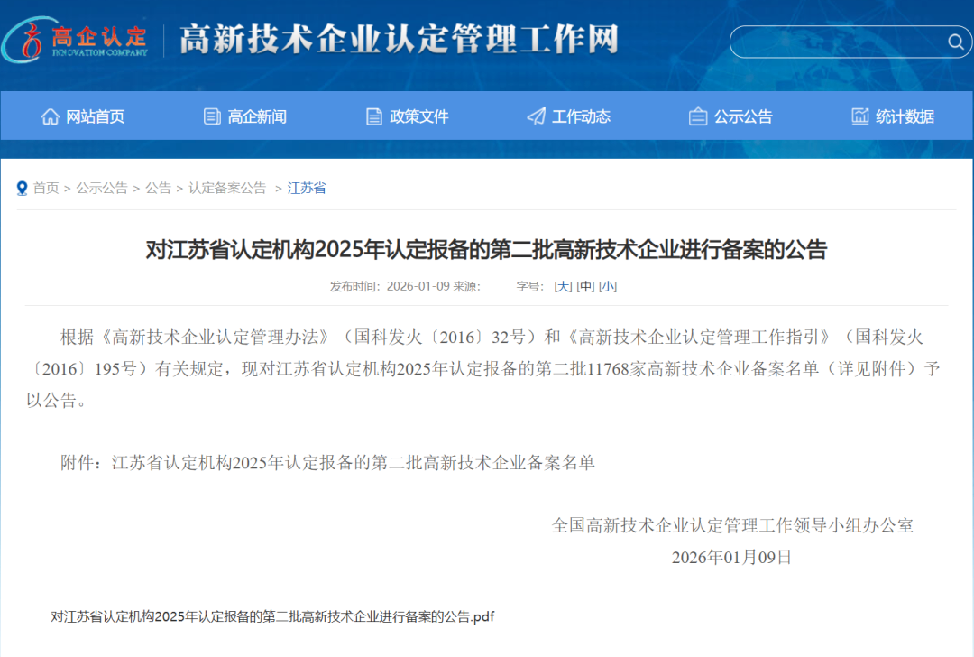 近日,根据《高新技术企业认定管理办法》及相关规定,全国高新技术企业认定管理工作领导小组办公室对江苏省认定机构2025年认定报备的第二批企业进行备案公示。MILE米乐凭借其扎实的科技创新实力与完善的研发管理体系,成功荣列在本次备案中。
